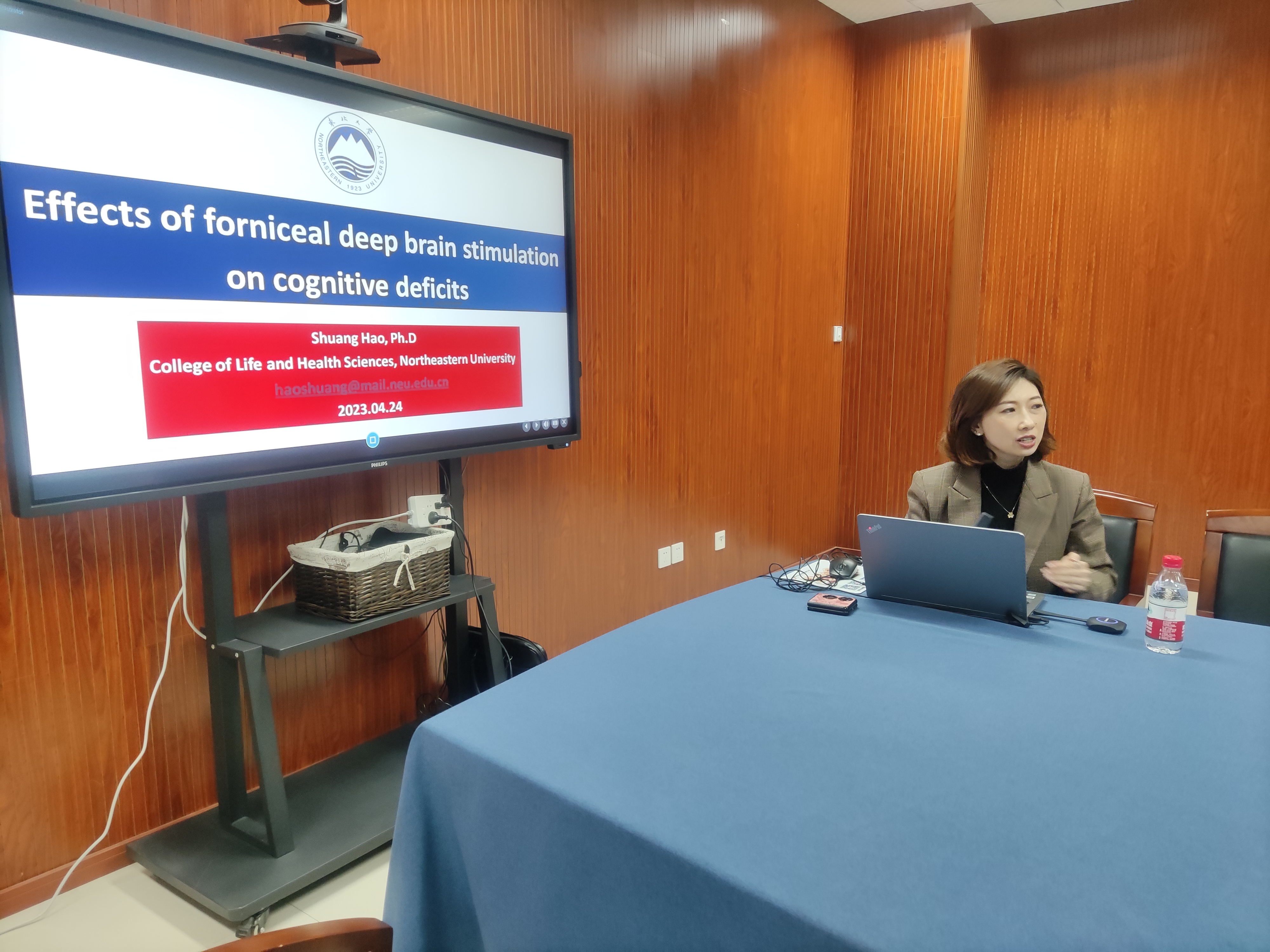 4月24日下午,我院在慎园15-313会议室举行了2023年第14期黄色仓库 撷英讲坛,东北大学“海外百人”青年特聘教授,国家级青年人才项目入选者,辽宁省“兴辽英才计划”青年拔尖人才郝爽教授,应邀来我院为师生们做了题为“Effects of forniceal deep brain stimulation on cognitive deficits”的学术报告。讲座前,薛大伟院长和张立明书记与郝爽教授进行了座谈会,随后薛大伟院长主持了论坛,神经发育生物学方向老师和研究生积极参加。