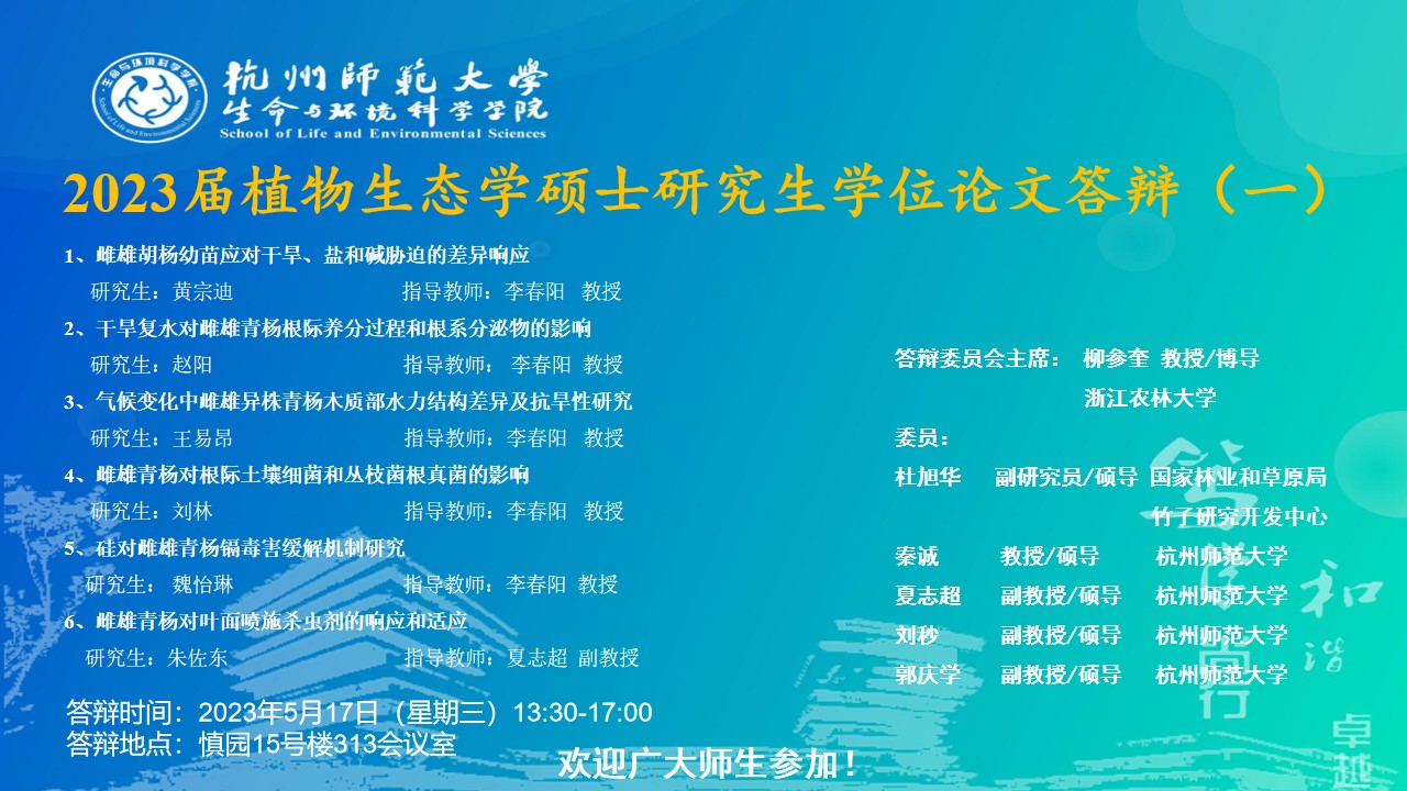 【2023届论文答辩】2023届植物生态学硕士研究生学位论文答辩安排