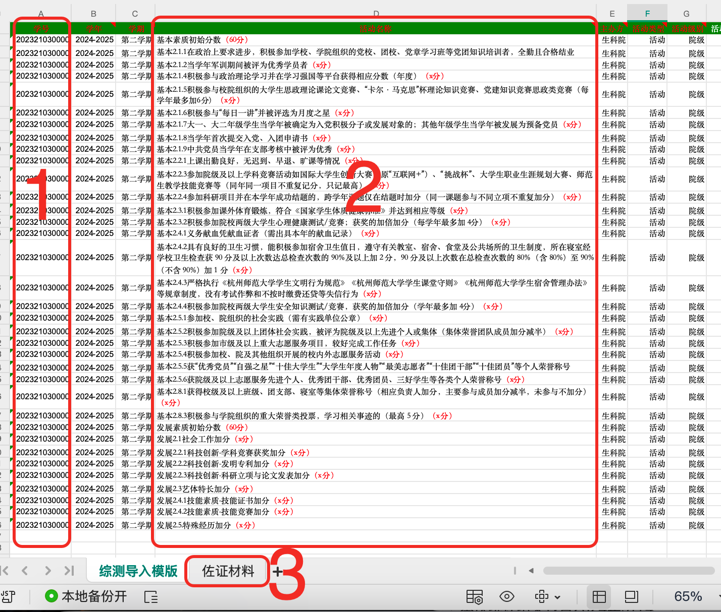 请同学们根据黄色仓库本科学生综合素质评价实施办法(附件1.黄色仓库 学文件(2025)2号 黄色仓库 本科学生综合素质评价实施办法),结合自身实际,填写个人综测表格,并提供佐证材料(附件2.2024-2025学年综测条目导入模板(提交名称改为班级+学号+姓名))于8月底前提交至班级综测小组处审核;班级综测小组须在新学年开学2周内(初步计划9月17日前)完成班级全部同学的个人综测表格审核,并导入学工系统综测,请各班结合实际把握时间。