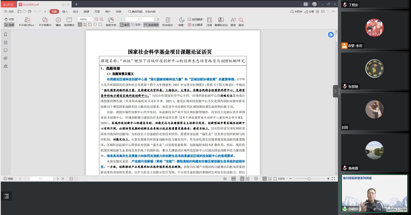 孙晓华教授谈了国家自然科学基金项目、国家社会科学基金项目申请的特点、区别,讲解了申请书撰写中的注意要点,并以两份国自科和国社科基金申请书为例,分享了项目选题、选题背景及意义、国内外研究现状、内容设计、研究方法、关键科学问题、研究创新等方面的经验和技巧。