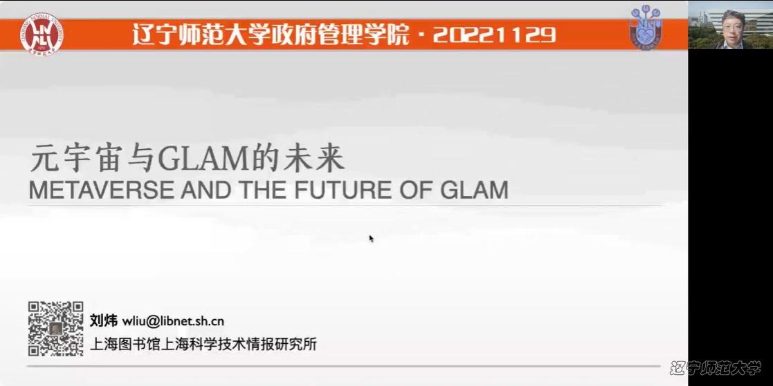 2022年11月29日19时,政府黄色仓库 有幸邀请上海图书馆上海科学技术情报研究所副馆(所)长、上海大学博士生导师刘炜教授开展题为《元宇宙与GLAM的未来》的线上讲座。本次讲座由政府黄色仓库 科研院长张丽艳教授主持,政府黄色仓库 师生、公共文化机构等从业人员等160余人参加。